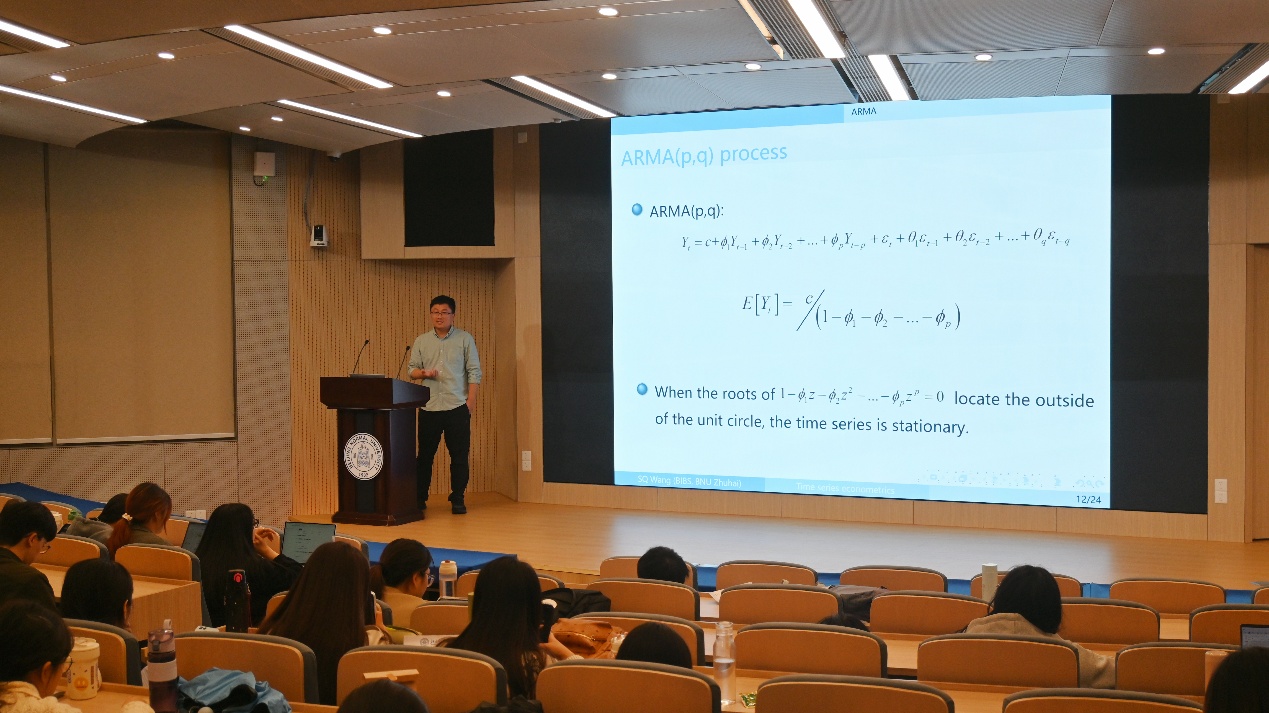 在“时间序列与金融计量经济学”专题中,讲座围绕时间序列分析的系统理论与应用层层展开。王升泉从平稳性、白噪声、随机过程等基础概念切入,循序渐进的讲解了移动平均(MA)、自回归(AR)及自回归移动平均(ARMA)等经典时间序列模型,深入阐释各类模型的统计特性与图示规律,重点剖析了不同模型下自相关函数(ACF)与偏自相关函数(PACF)的表现特征。为让理论更易理解,他结合英国通货膨胀率的实证案例,生动演示了从数据检验、模型识别到估计检验的时间序列建模全流程,让同学直观掌握知识要点。